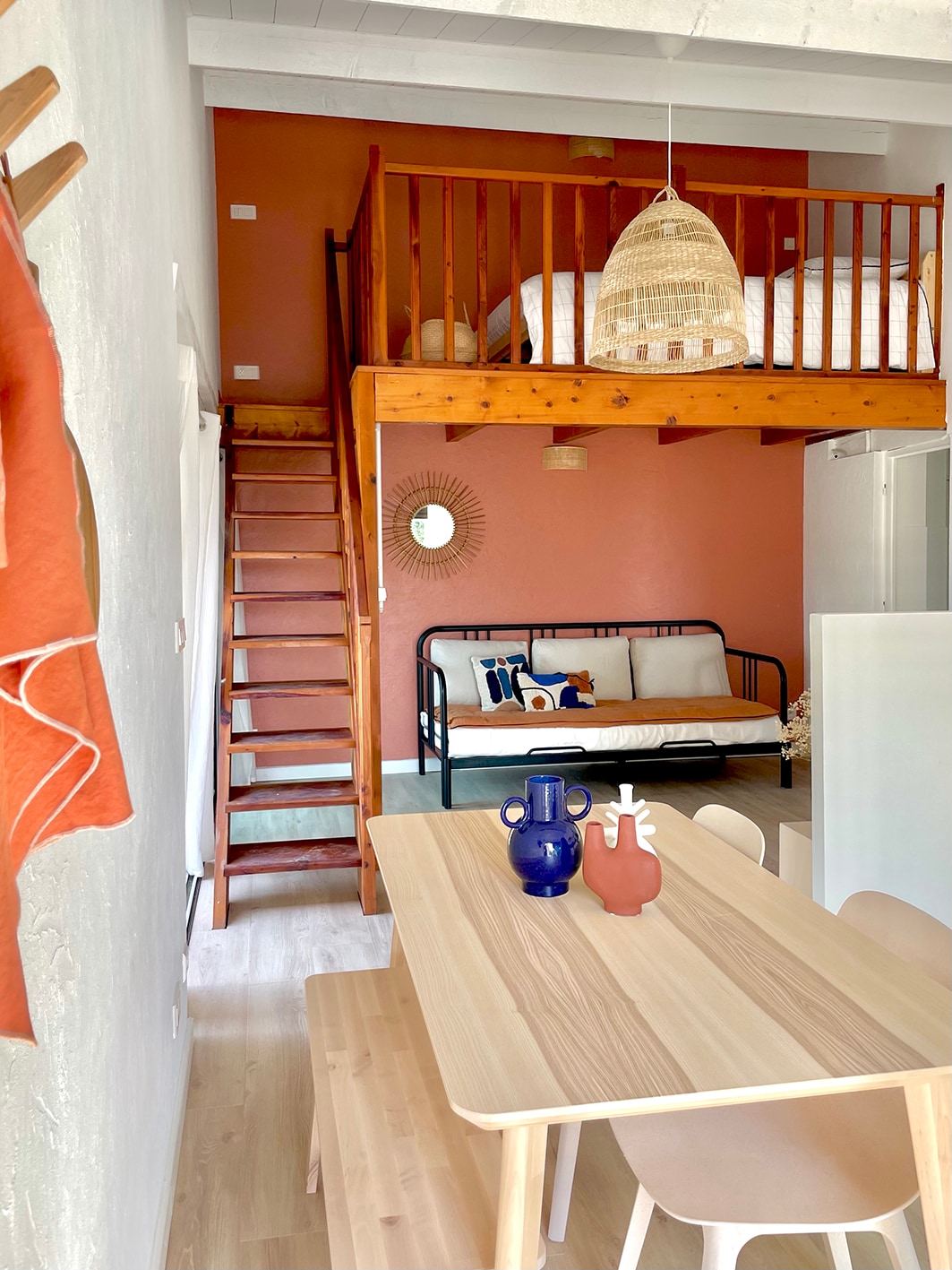 Oppdag vår bolig La Cachette de Philie. I skyggen av furutrærne, en suite på 42 m² som består av et hovedsoverom med en seng på 160 cm med havutsikt, et soverom med to enkeltsenger, et utstyrt kjøkken og en stue. Du vil også ha nytte av en privat og skyggelagt terrasse. Oppdag også vårt andre sjarmerende overnattingssted Le Perchoir, på eiendommen Maison Chaban. Utstyr: - Nespresso og vannkoker, - Kjøleskap -Multifunksjonsovn -Induksjonsplate - Klimaanlegg.