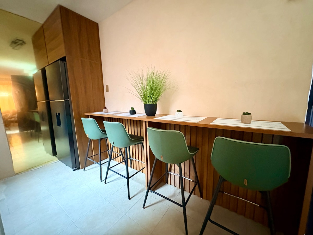 Slapp av sammen med hele familien på dette fredelige bostedet. To minutter fra sentrum, fem kvartaler fra Soriana-supermarkedet, ADO, gatemarked, marked, tre minutter fra sentrum og ti minutter fra de viktigste strendene. Hele huset har aircondition, to soverom, kjøkken, stue og spisestue.