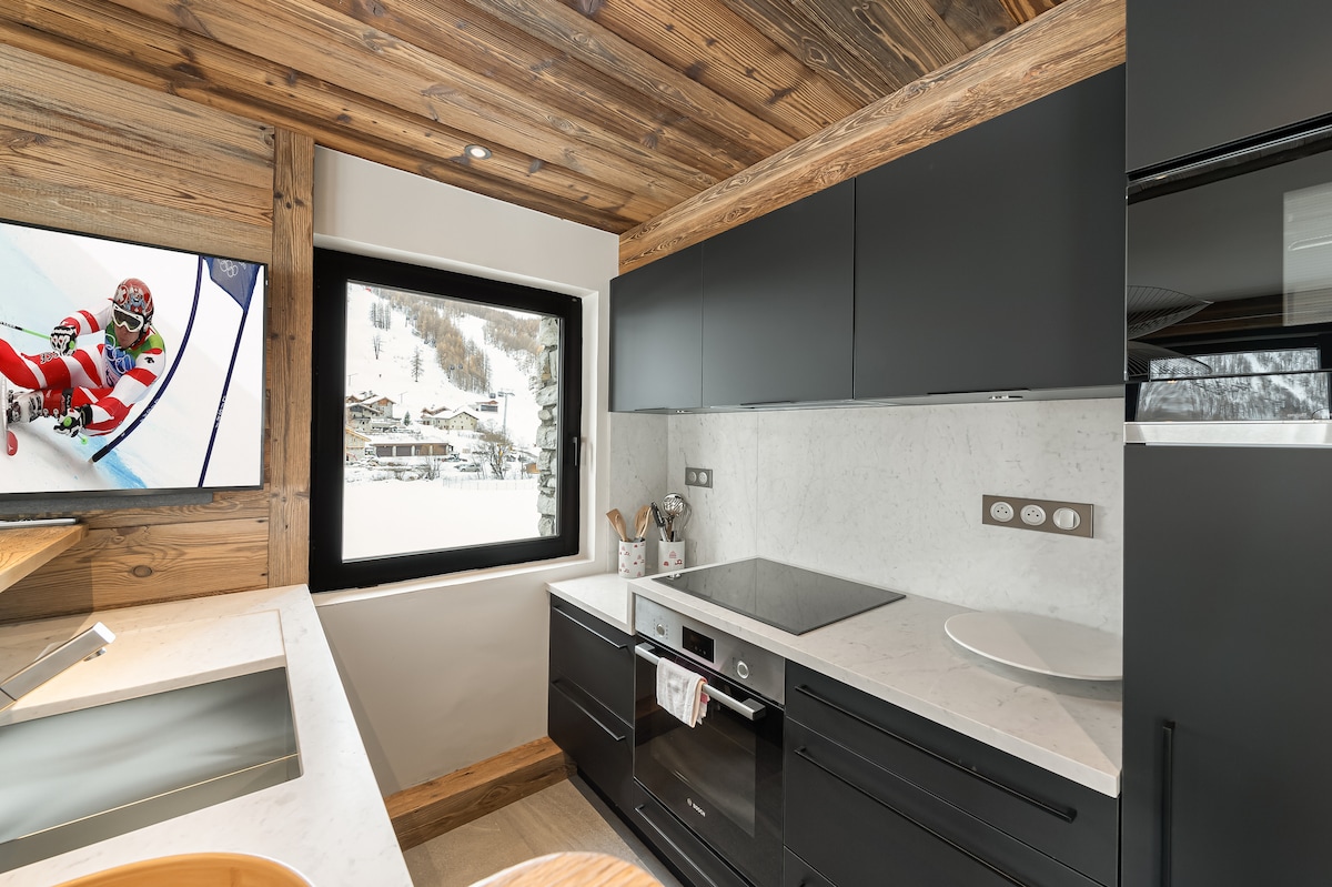 Leilighet på 31m2, totalrenovert, ideelt for 5 personer. Ved foten av løypene og heisene, skilager i første etasje, ved siden av kjøpesenteret, betjenes det av gratis skyttelbusser som forbinder La Daille med sentrum av Val d'Isère. Varm og komfortabel, med utsikt over løypene, den er godt utstyrt for å gjøre oppholdet ditt så enkelt som mulig. Sengetøy og håndklær er inkludert, inkludert rengjøring. Concierge på stedet for å ta seg av deg og ekstrautstyr.