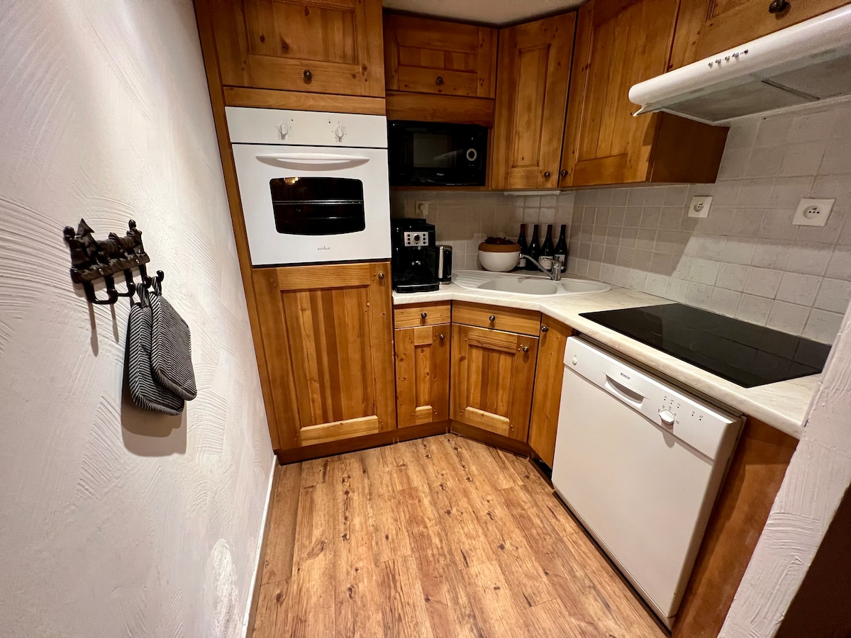 Leiligheten er fullstendig renovert, ligger ved foten av bakkene, 2 balkonger vendt sørover. Stor stue, kan deles med en stor skyvedør i tre for å lukke et soverom. 2 senger 160 cm Mulighet for garasje 80 € per uke Kjøkkenet er utstyrt med oppvaskmaskin, keramisk kokeplate, mikrobølgeovn, racletteapparat ...... Badet er fullt flislagt med dusj, badekar, vaskemaskin., Den eksepsjonelle beliggenheten gir en fantastisk utsikt over fjellene.