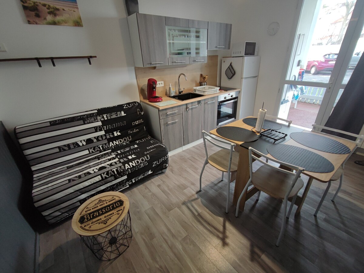 Bolig på 37 m2 i rekkehus, privat tilgang til sykkelstier og strender (2 km fra sentrum) Består av to rom, spiseplass, TV, Wi-Fi, en seng BZ, et kjøkken, et soverom med en seng på 140 cm, en garderobe og bad med toalett + oppbevaring. Utendørs: 30 m2 inngjerdet, med føttene i sanden. En parkeringsplass 50 m på inngjerdet privat eiendom med en liten tilgangsvei skog/sand. (sengetøy i tillegg).