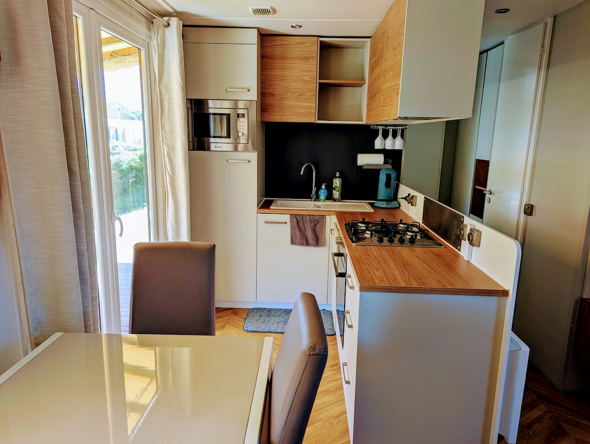Mobil-home sous le pin Camping 4* Lac des Rêves 40m2 Lit parental 160cm + matelas latex Piscine chauffée avec minimum un bassin en basse saison et animations toute la saison. (achat en sus FUNPASS auprès du camping) Emplacement au calme à 5min à pied de la fun zone. Palmeraie vue sur le lac Accès vélo mer Montpellier à 7km Ping-pong, terrain tennis, basket, foot, mini-golf, pétanque, fitness, accro-game, trampoline, pumptrack, aires de jeux ++, aqua fitness, tir à l'arc... Club enfants dès 3 ans