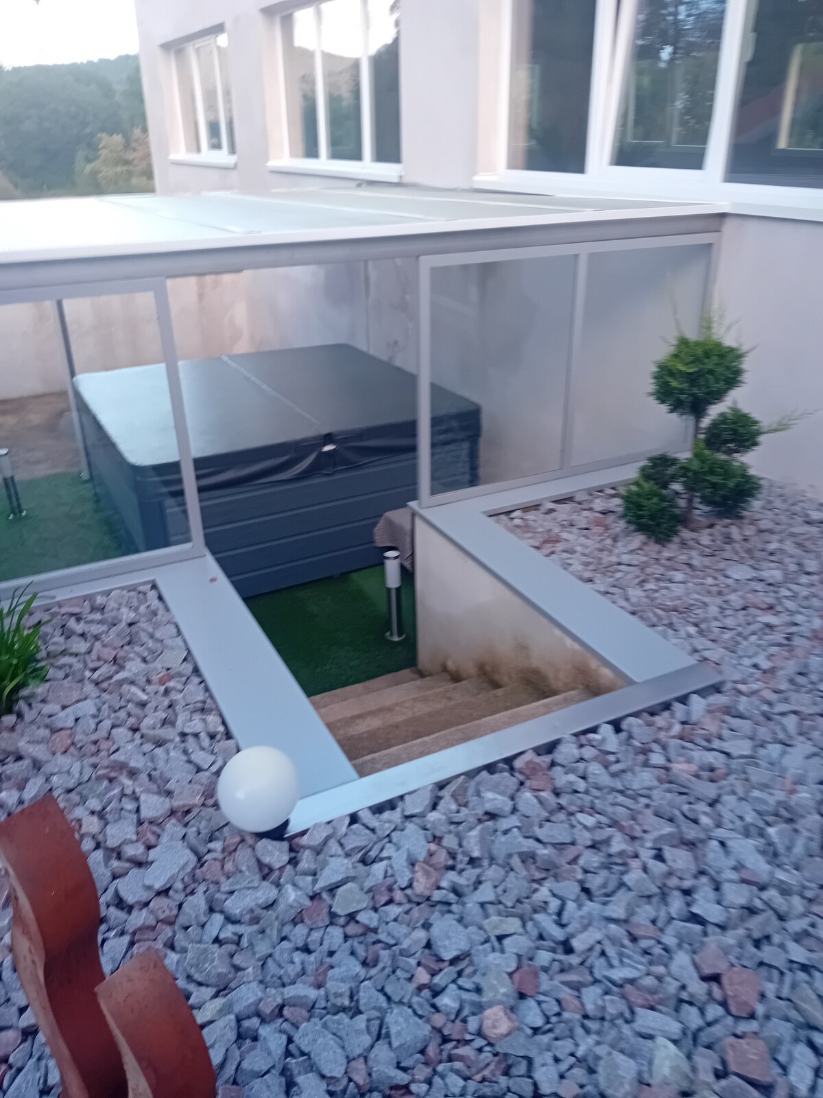 Hvem har ikke drømt om å sove med hodet i stjernene? Kuplen er ideelt plassert 840 meter over havet i hjertet av Voggeskogen, isolert fra alle naboer, for optimal ro. Plassert på en treterrasse, nedenfor gården vår og i hjertet av alpakka-parken, kan du lade opp batteriene på et sted som er like harmonisk som det er estetisk. Når natten kommer, kan du beundre det fascinerende skuespillet av stjernenes glitrende lys fra sengen din, og vibrere til lydene av naturen.