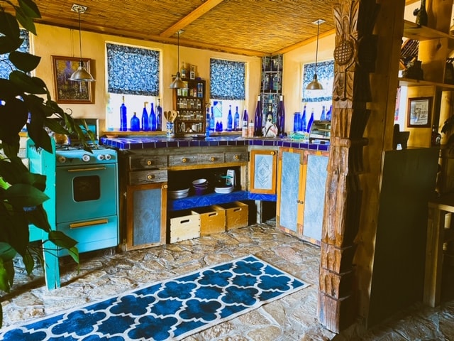 The Blue House sleeps 4 in a quiet papercrete abode. Complete with a Queen and a full bed inside in separate rooms, 2 full sized beds outside, solar power, full kitchen, interior bathroom with sink/toilet/shower, chiminea fireplace inside and outside. 500 square feet decorated in Monet style. Wonderful views!
