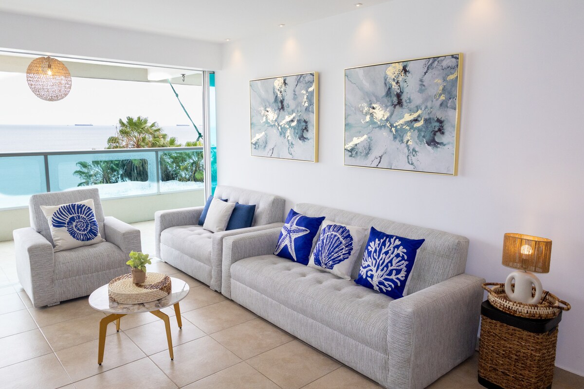 Ta en pause og slapp av i denne rolige leiligheten. Suite 3C Sunrise, ideell for par eller små familier (to til fire personer). Den ligger noen skritt fra Chipipe-stranden og kombinerer komfort og stil med et hovedsoverom, to fullt utstyrte bad, stue med sovesofa, utstyrt kjøkken, smart-TV-er, raskt trådløst nettverk og digital lås. Et moderne, funksjonelt og perfekt sted å nyte Salinas i total komfort.