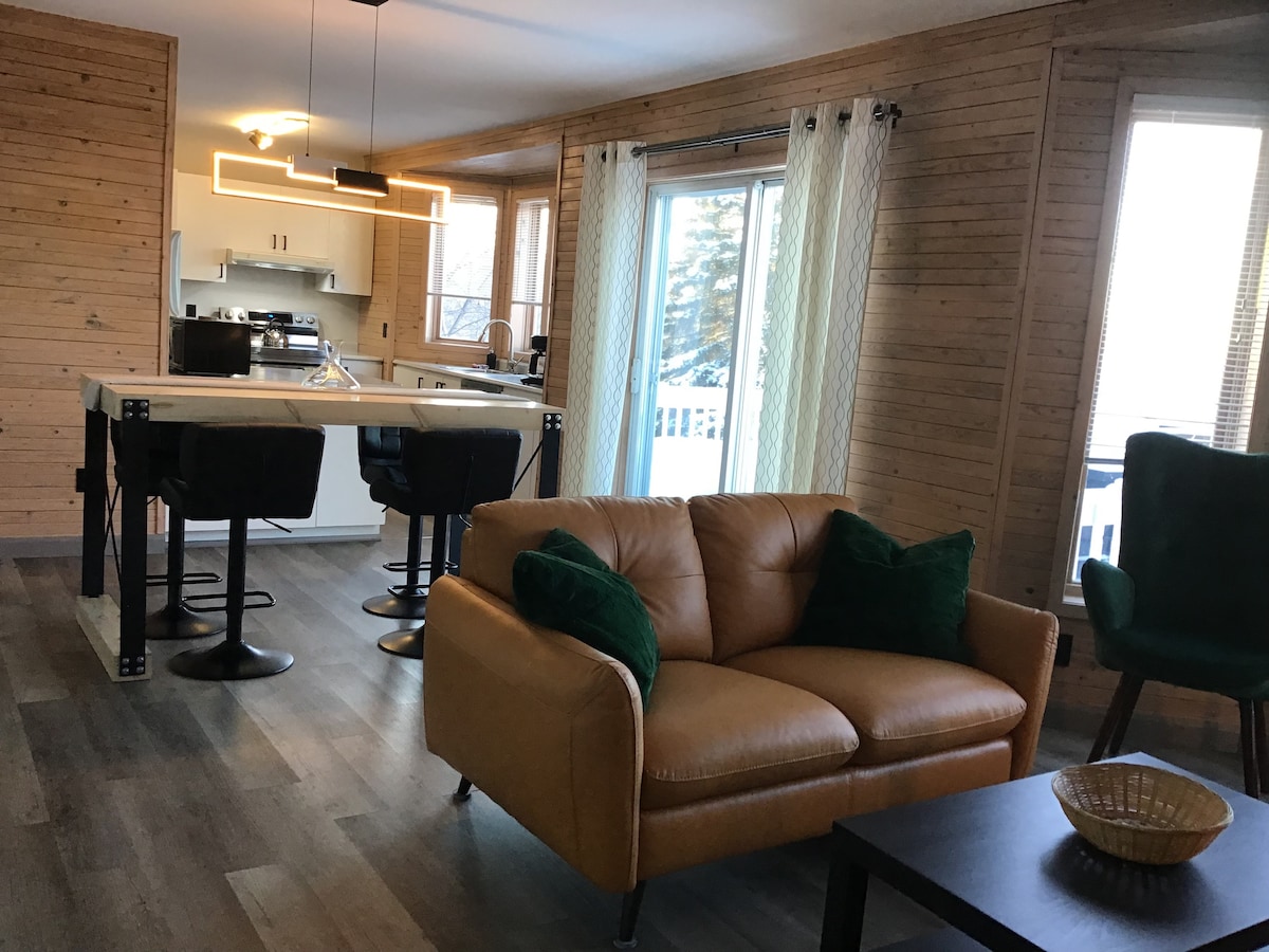 Villa med basseng som ligger mellom elv og fjell. Eskal, skiller seg ut med sin rene design og store vinduer. Fullt utstyrt, har boligen 1 spa, 3 peiser, 3 romslige soverom med eget bad, 1 spillrom og ikke minst 1 oppvarmet basseng med utsikt over St. Lawrence-elven! Du vil utvilsomt bli sjarmert av den spektakulære soloppgangen og den myke lyden av elven og de nærliggende fossefallene. Kapasitet maksimalt 6 voksne og 4 barn.