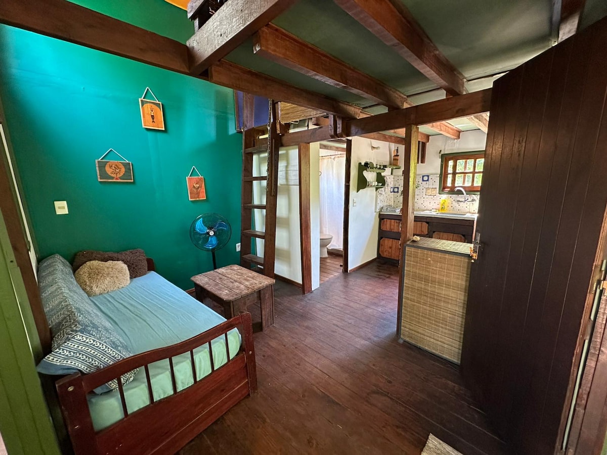 Acogedora y completa cabaña. En zona arborizada , tranquila y segura, a dos cuadras del super y algunos minutos caminando de la playa . Diez minutos caminando al centro. Cuarto con cama matrimonial + entrepiso, Living con sillon cama. Cocina completa, con utensillos nuevos y baño privado con muy buena ducha. Jardin de atras compartido con Eco Hostel con fogón, hamaca , mesas. Proyecto de turismo sostenible y consciente. Huerta, reciclaje, compostaje, agua de lluvia, húmedales, etc.