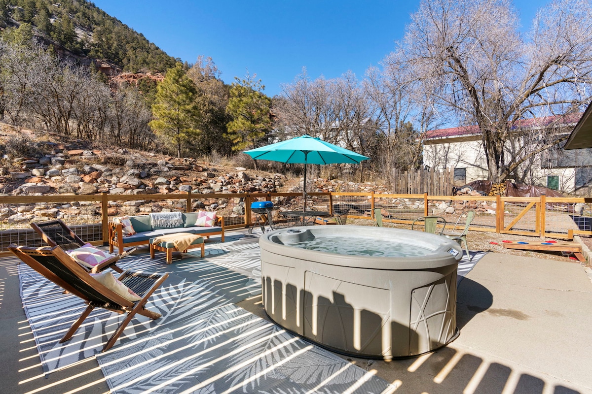 Oppdag Blue Spruce Haven på Animas Valley Lodge. Denne gjestesuiten med to soverom har fantastisk utsikt over Animas City Mountain og rask tilgang til Durango sentrum og Purgatory. Innendørs kan du nyte en koselig peis og en platespiller til favorittvinylplaten din. Ute er den private, fullstendig inngjerdede hagen bygget for å underholde, med boblebad, bålplass og sitte- og spiseplasser ute. Med et fullt utstyrt kjøkken og plass til at hundene dine kan streife fritt rundt, har denne suiten alt du trenger for å finne deg til rette.