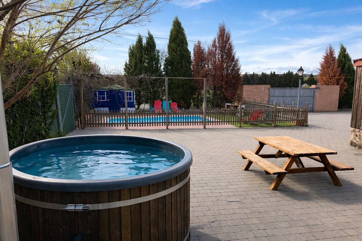 Oppdag denne miljøvennlige hytta mindre enn én time fra Madrid, perfekt for å koble av blant trær og stillhet. Slapp av i jacuzzien med 40 grader under stjernehimmelen, eller nyt frokosten under pergolaen omgitt av grøntområder. Fullstendig privatliv og en 950 kvm inngjerdet tomt, slik at hundene dine kan løpe fritt og trygt. 🏙️ Madrid – 55 minutter med bil. 🏞️ San Juan Reservoir – tolv minutter med bil. 🌳 El Castañar (og turstier) – 15 minutter med bil