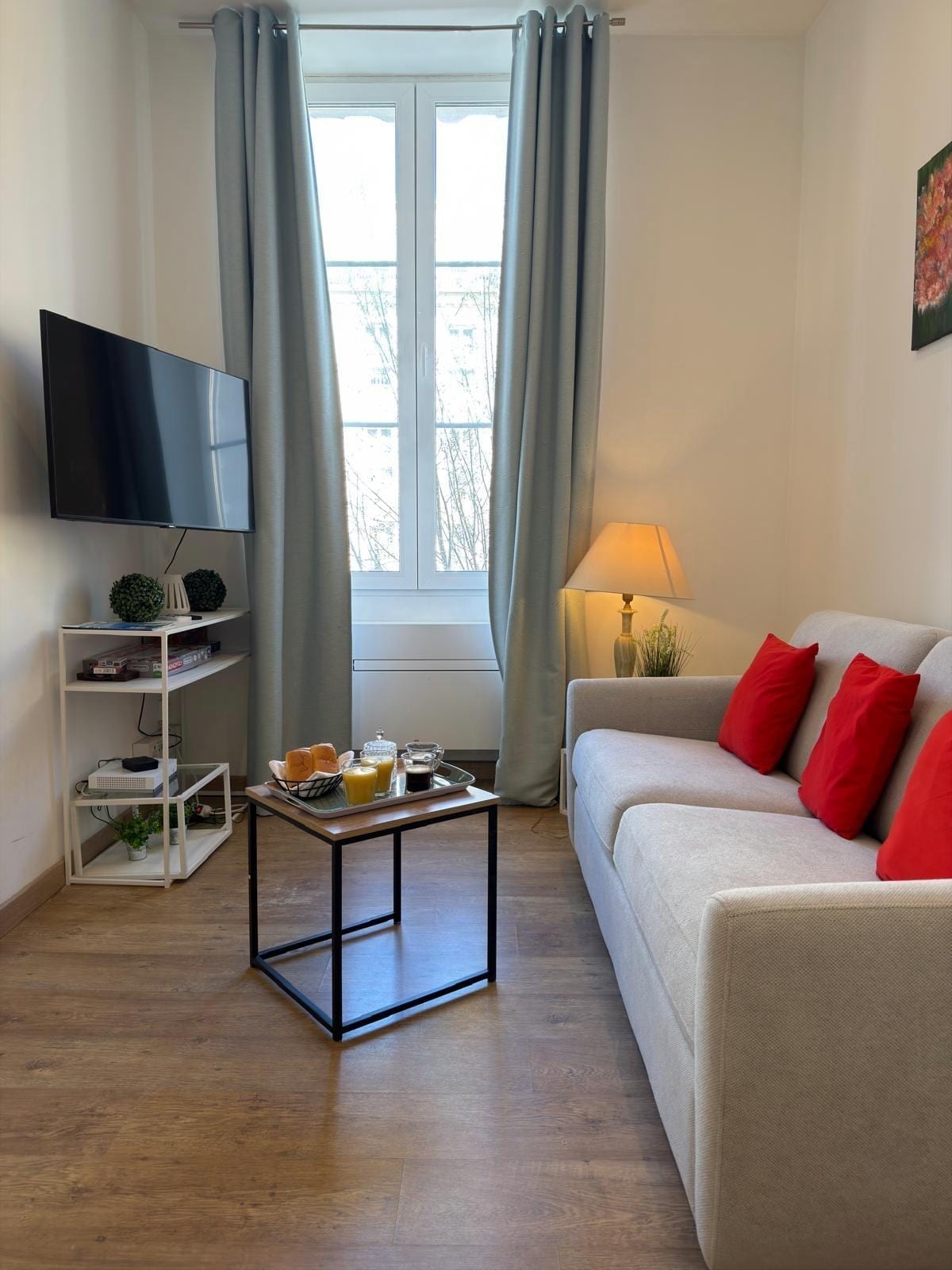 Fullstendig renovert av en arkitekt i 2023, denne elegante leiligheten formet med luksusmaterialer vil gi deg alle bekvemmeligheter for et UFORGLEMMELIG opphold i regionen vår. Enten dere er et par på ferie, en fryktløs reisende eller på en forretningsreise, vil du ikke ha problemer med å føle deg HJEMME! Leiligheten ligger praktisk i sentrum av Nice: Fin togstasjon: 5 minutters gange. Massena Square: 5 min gange Old Nice: ti minutter til fots. Strand: 12 minutters gange.