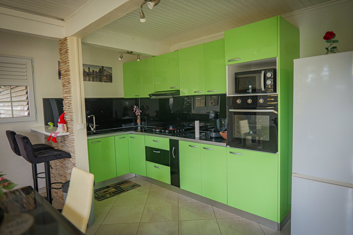 Julies hus tilbyr deg en leilighet med klimaanlegg ved foten av Mount Pelee. Vi gjør vårt beste for å fremme en ren og desinfisert leilighet ved å ta hensyn til maksimalt antall detaljer. Ligger i et veldig rolig og avslappende boligområde, vil du dra nytte av en sikker parkeringsplass samt en overraskelse som tilbys ved ankomsten din. Denne leiligheten har nødvendig komfort for fjernarbeid og lange opphold.