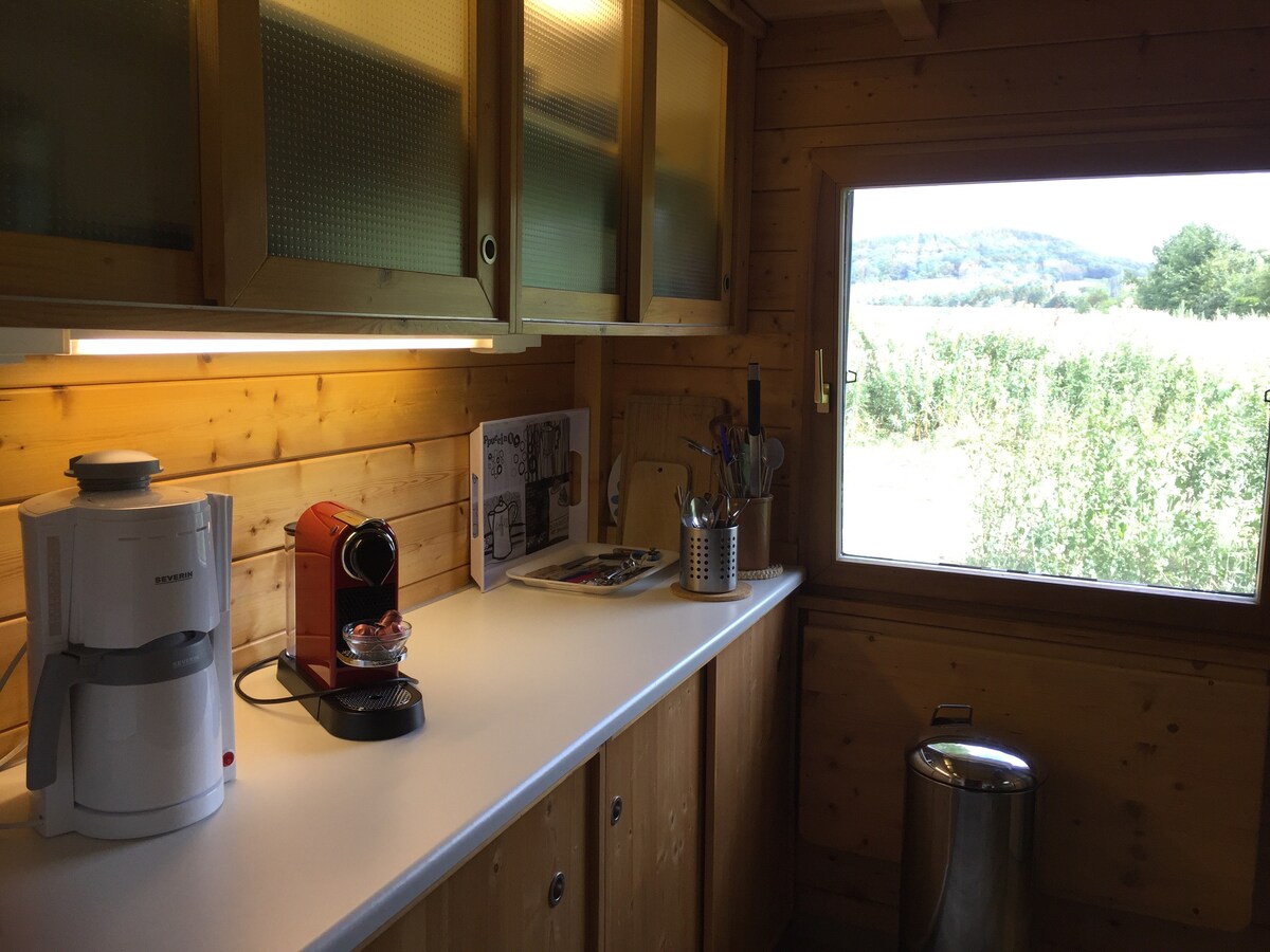 Glem bekymringene – Dette rolige, frittstående huset inviterer deg til frokost på terrassen med en bred utsikt over åkrer, skog og masse grøntområder. Perfekt for en ferie eller en helg for to. På kalde dager eller koselige kvelder er det en separat badstue, et boblebad og en kakkelovn som kan fyres med ved. Shopping ligger i gangavstand, samt mange vakre tur- og skogsstier.