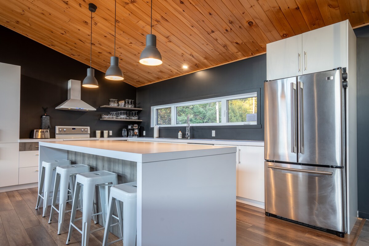 Welcome to La Khabine! This cozy, modern cabin comes with all you need to relax and connect with nature. Enjoy a glass of wine with the sound of a crackling fire in the wood burning fireplace. Take in the view of the forest through the surrounding floor to ceiling windows. Relax in the private outdoor cedar barrel sauna. Natural self-care products, firewood, laundry soap, and high-speed Wi-Fi are all complimentary. We hope you'll love our little cabin of windows as much as we do :)
