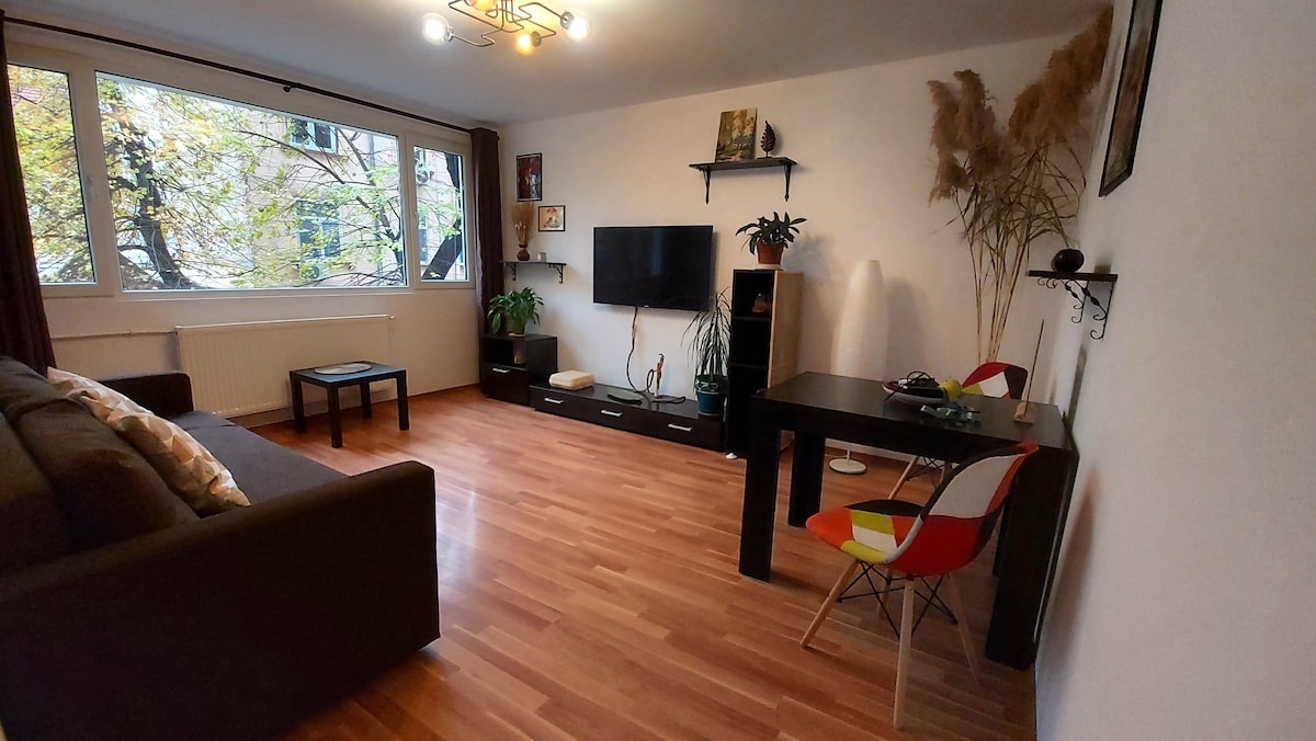 Denne nyrenoverte leiligheten i Bucuresti tilbyr et fredelig tilfluktssted med vakker utsikt over parken, bare ti minutter fra sentrum. - Leiligheten har en romslig stue. - fullt utstyrt kjøkken - To koselige, romslige soverom med rent sengetøy og komfortable møbler. - moderne fasiliteter, inkludert trådløst nettverk med høy hastighet og en smart-TV. Det er perfekt for både avslapning og utforskning av byen. I nærheten av offentlig transport, kaféer og butikker, er det en ideell base for oppholdet ditt i Bucuresti!