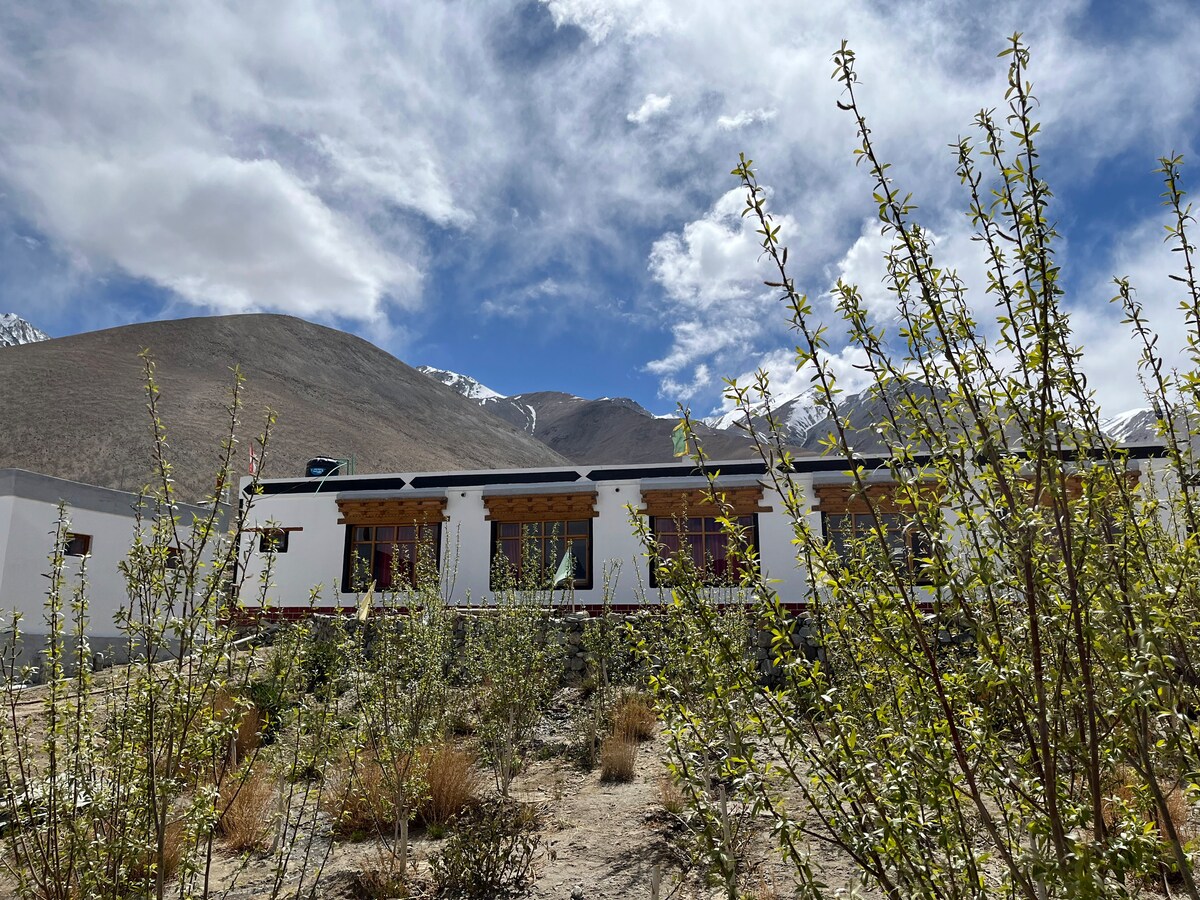 Vårt lille gjestehus ligger i hjertet av den fantastiske Nubra-dalen, og tilbyr et fredelig opphold midt i tradisjonelt landsbyliv, med fantastisk utsikt over fjellene og varm ladakhisk gjestfrihet. Bare minutter fra lokale attraksjoner og grunnleggende fasiliteter. Det er den perfekte blandingen av komfort, kultur og bekvemmelighet. Enten du søker fred, kultur eller eventyr, er stedet vårt den perfekte basen for reisen din gjennom Ladakh.