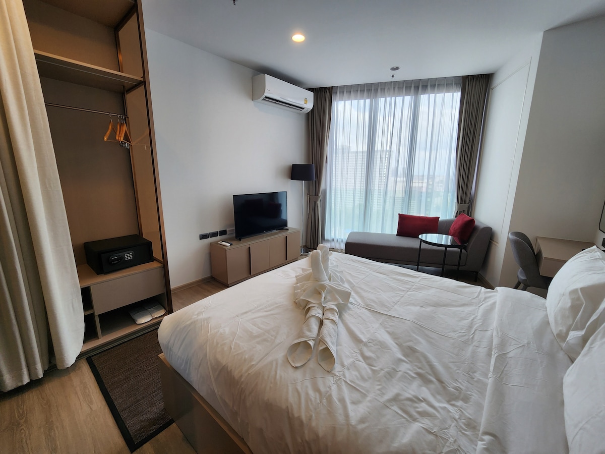 40floor 26 kvm studio (kingsize-seng), med flott utsikt over sjøen. Rommet vårt ligger i Unixx Condominium. – to minutters gange fra travle gater for velsmakende lokal mat – syv minutters gange fra den store bryggen og gokartbanen – ti minutter til gågaten – 20 minutters gange til stranden – to svømmebassenger/badstue/treningsrom – flott utsikt over skyhagen – 31 km til U-Tapao Rayong-Pattayas internasjonale flyplass.