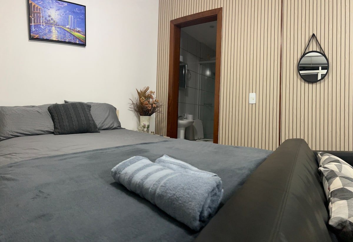 Vær oppmerksom på at det er obligatorisk å oppgi fullt navn og identitetsnummer for alle gjester til verten, et krav fra leilighetskomplekset. Brasília-leiligheten, nylig renovert og dekorert til ære for Brasils hovedstad. Ideell for opptil 3 personer. Boligen har en stue (med en praktisk arbeids-/studestasjon), soverom, bad, kjøkken (med et lite serviceområde) og en innendørs garasje. Vi tillater ikke besøk.