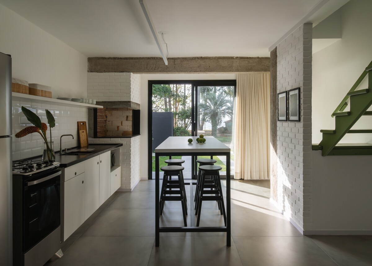 koselig hus å nyte med familie/venner, to kvartaler fra stranden. Kom og oppdag den vakre byen Arambaré, i et godt plassert hus nær sentrum og med alt du trenger. Stor terrasse for kjæledyr med rikelig med skygge, grillområde, fullt utstyrt kjøkken, soverom med klimaanlegg og stue med sovesofa. strøm og vann er inkludert i leien