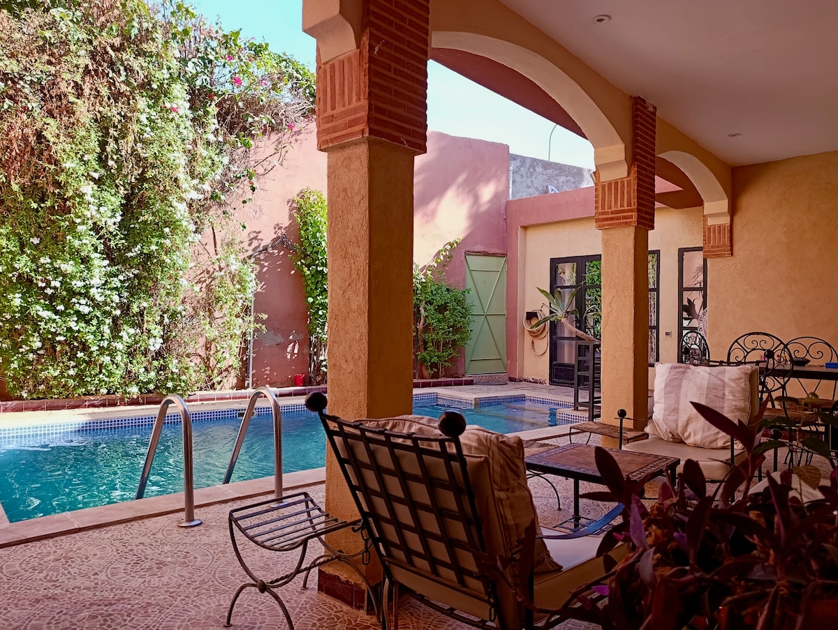 Vår sjarmerende lille villa med oppvarmet basseng fra 10. til 4. måned uten overforliggende hus og garasje for familier, veldig rolig og uavhengig, ⁰Gi deg litt privatliv i fredelige omgivelser. Ideelt plassert i nærheten av Ourika-veien, 1 min der det er taxi- og busstasjon. Ligger bare 7 minutter fra CarrefourMazar og Megarama-kinoen, 13 minutter fra flyplassen og 15 minutter fra Jamee Elfna, togstasjonen og bussholdeplassen CTM, nær alle fasiliteter, i et grønt og avslappende område uten overforliggende hus.