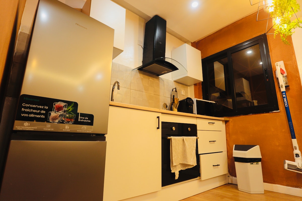 🏅Blant de 10 % best likte hjemmene på Airbnb. Nyt en stilig leilighet med tre soverom i hjertet av sone 4. Den er lys, elegant og koselig, og har smakfull innredning, myke toner, gyldne aksenter og lokal kunst. Perfekt for å slappe av eller jobbe eksternt, med sengetøy av hotellkvalitet, et fullt utstyrt kjøkken og daglig rengjøring inkludert. Sikkerhet døgnet rundt sikrer trygghet under oppholdet i et av Abidjans mest pulserende nabolag.