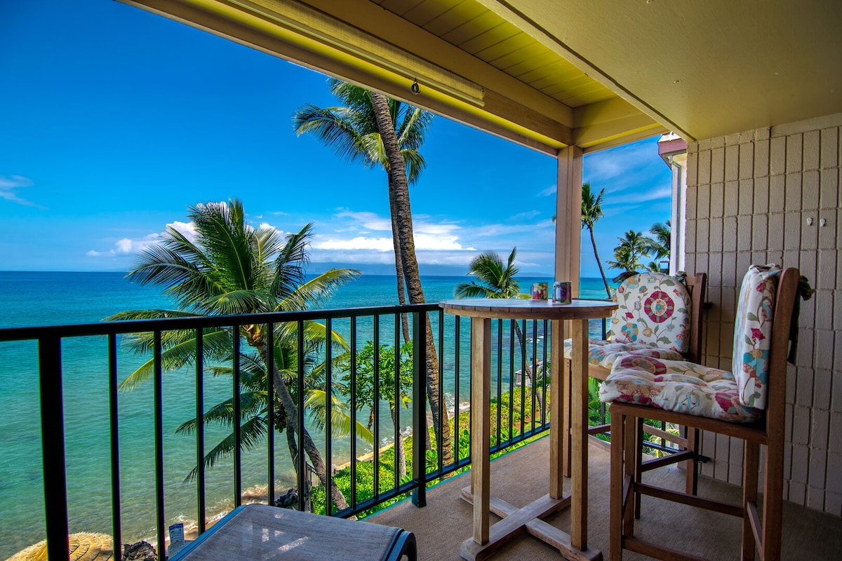 Lokalt eid og drevet Leilighet med ett soverom og to bad med den beste direkte beliggenheten ved stranden, panoramautsikt over havet, solnedganger og sesongbasert hvalskåding. Eieren har ikke spart på utgifter til å renovere denne enheten, noe som gjør den til en av de fineste enhetene i hele Mahana. Våkn opp til den kjølige tropiske brisen og lydene fra kystlinjen bare 50 fot unna. Vinduer fra gulv til tak i stuen og soverommet gir den fantastiske utsikten og varme Maui-solen inne, mens sentral klimaanlegg holder deg kjølig inne.