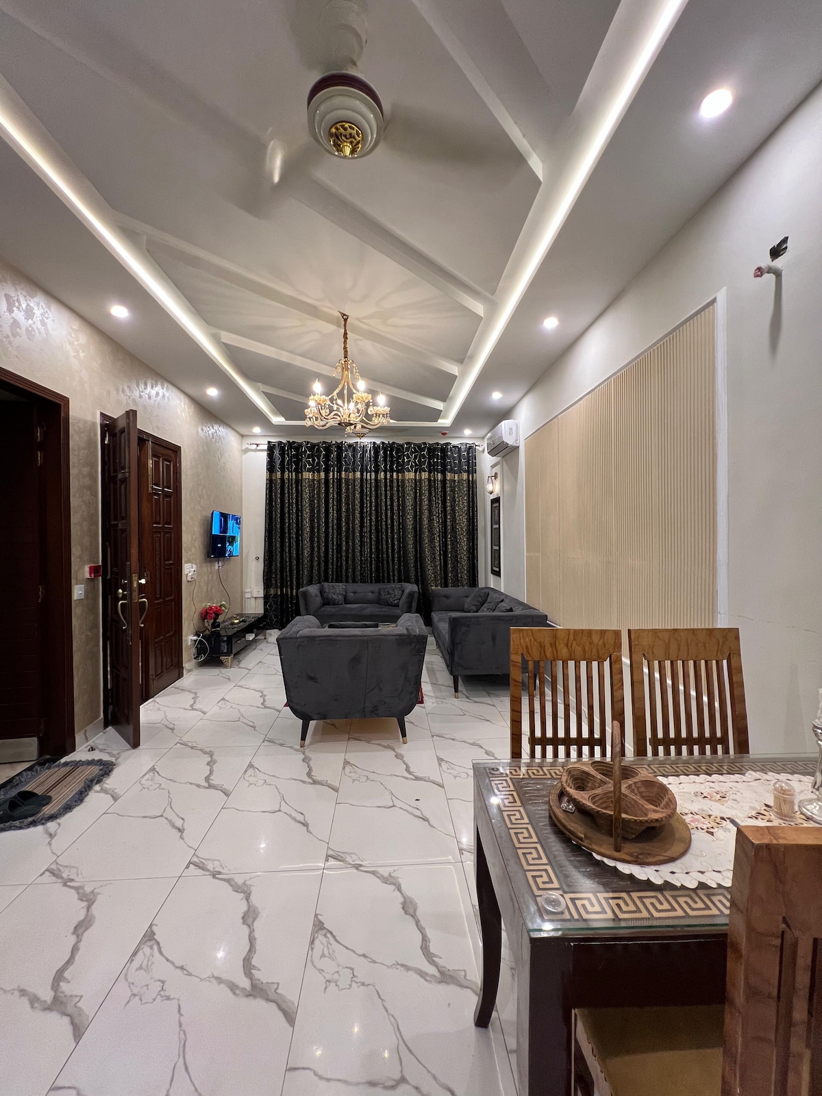 Luxury 5‑Marla 3BR Home in DHA Phase 7 Located in the serene of DHA Phase 7, minutes away from Raya Fairways • Two floors with TV lounges on each level • 55″ LED TV in main lounge • Three bedrooms with individual TV connections • Fully equipped kitchen • 6-chair dining area • 24/7 hot water • Air-conditioning throughout • Fast Wi-Fi and all modern amenities • Family-friendly, quiet stay • Close to Raya Fairways & Carrefour House Rules: Family-Friendly, No Parties or Loud Gathering
