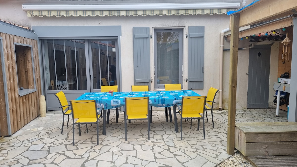 Maison familiale à L’Aiguillon-la-Presqu’île, à moins de 5 min en vélo de la plage. Idéale pour 7 pers., avec jardin, terrasse, barbecue, vélos et remorque enfants. Jeux de société, TV connectée, internet, cuisine toute équipée (Airfryer, Senseo, etc.). -> Les lits seront faits à votre arrivée, et les draps ainsi que les serviettes de toilette seront fournis 🧺 Environnement calme et terrain, entièrement clos, parfait pour des vacances en famille entre océan, nature et détente.