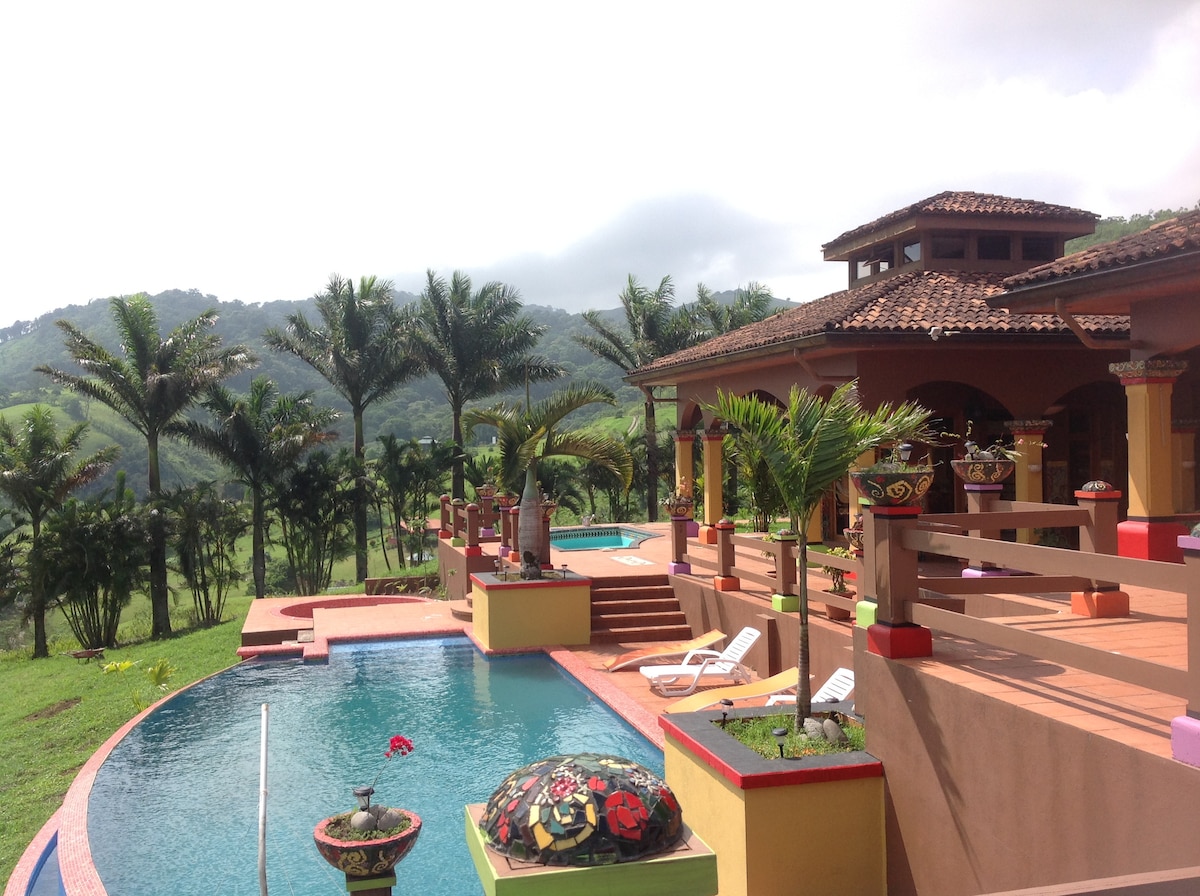 Unusually open resort style beautiful Villa on over 3 1/2 acres overlooking Lake Arenal . Surrounded by rain forest and pastures. 4 bedrooms. 4 full 2h bathrooms w/bidet shower heads. 2 bdrms with att. bathrooms. A large room with a loft. A small room w double bed. Swimming pool / solar heated hot tub. Accommodates 10 adults plus 2 children. A place for yoga, meditation healing and peaceful relaxation. There is a central courtyard with propane fire place. Parties are allowed before 9 pm