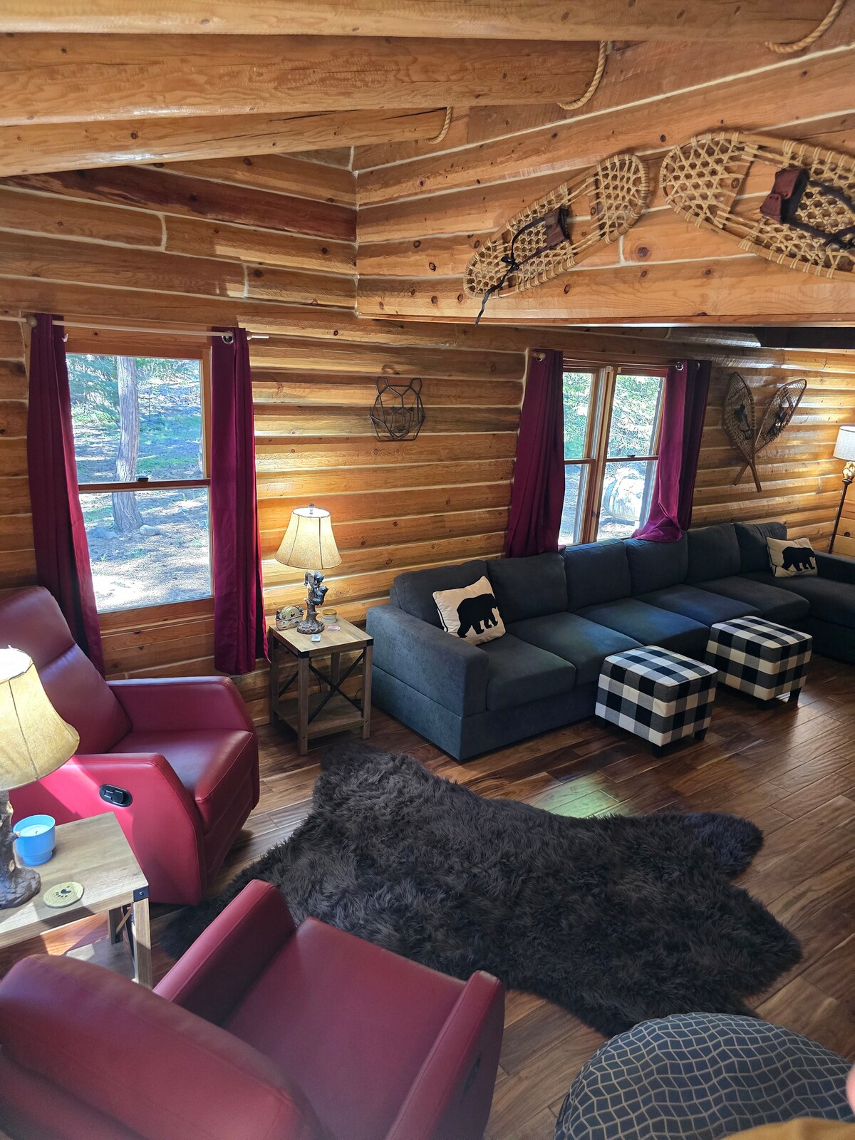 Relax in this newly built log cabin on over 3 private acres of land at an elevation of 4,300 ft. The 1350 square foot cabin has a large master loft with a large private bathroom and media area. The loft also has a balcony that gives you amazing views of the surrounding trees and is the perfect place to listen to birds and watch wildlife. The cabin is ideal for a couple, small family, best friends, or an individual looking for a personal retreat in the forest. Dogs are welcome!