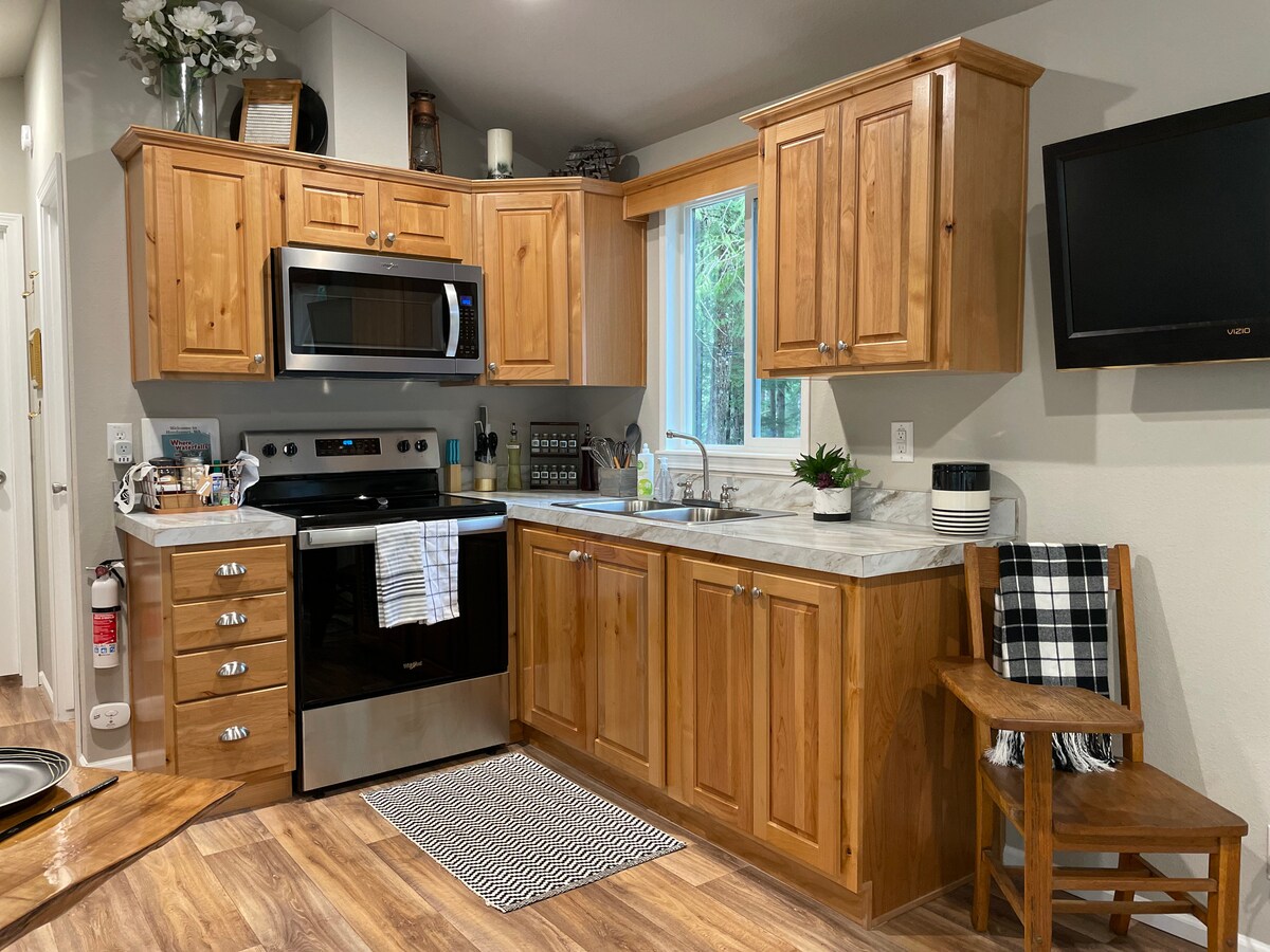 Come enjoy the peaceful ambiance of the Lake Cushman area in this adorable 1 bedroom cabin. This cabin comes with a unique covered outdoor living area that includes a hot tub and multiple seating options. It is fully equipped for spring and summer fun as well as cozy fall and winter getaways. Also comes with a guest pass for you to be able to enjoy beautiful Lake Cushman and Lake Kokanee, which are both about a 10 minute drive away. Lake Cushman Golf Course and disc golf course are minutes away.