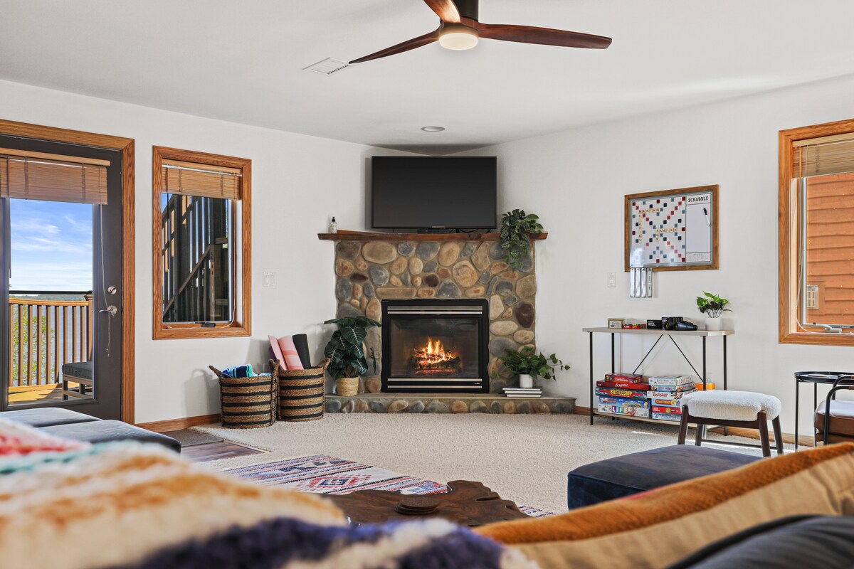 Vi er den ettertraktede beliggenheten ved innsjøen ved Castle Rock Lake og rett ved alle feriestedets fasiliteter. Vi er bare 45 minutter fra WI Dells. Du har direkte tilgang til en privat strand, et basseng, boblebad, pickleball, tennis, sandvolleyball, basketball, golf, et (kardio) treningssenter, en sandpark og Tiki Bar! Å gå tur på feriestedet er en av våre favorittrutiner om morgenen. Vi elsker solnedgangene og nyter marshmallows over leirbålet. Alle er så vennlige her! Det er avslappende - vi nyter lur nesten hver dag.