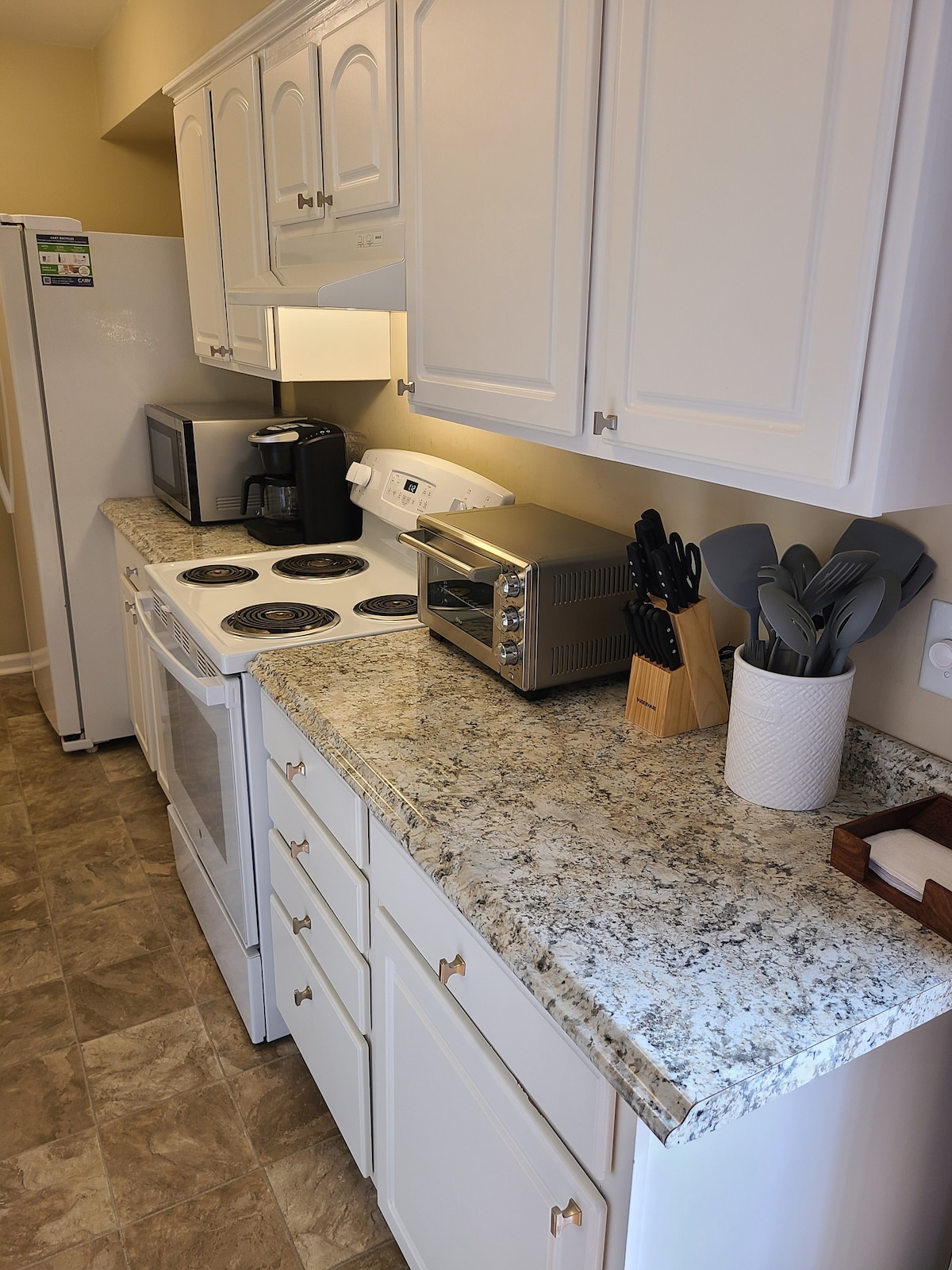 This fully-furnished one-bedroom "garage apartment" is attached to our main home, but you will have your own private entrance! You can expect this to be your home-away-from-home with all the practicalities and necessities taken care of. No stairs are required to the ground-floor entrance except for two little ones in front of the door. Popular for shorter stays, but more than suitable for longer stays, with ample storage, a combo W/D, compact D/W, and dedicated HVAC system. Amazing location!