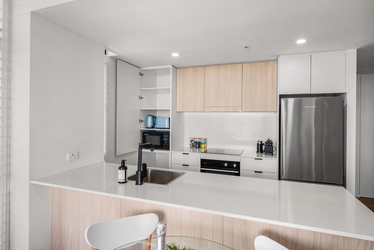 Luksusleilighet med to senger og to bad med utsikt over byen. Nyt en luksuriøs leilighet på 88 m² i sjette etasje i Newcastle, med glimt av havnen og havet fra den enorme balkongen på 32 m². Varme tregulv og myke, nøytrale toner skaper et rolig, moderne opphold. Basseng, treningssenter og fantastisk takterrasse med griller og utsikt over Newcastle. Beliggende i pulserende Newcastle West, er du bare noen minutter unna kaféer, restauranter, havnen, bybanen, CBD og strender. Gå overalt og nyt det beste av livet i sentrum.