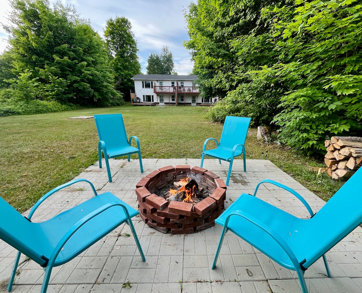 Velkommen til AAT, A-Frame-ferie ved vannet. Plassert over den franske elven. Omgitt av 2+ hektar nordlig skog, blander dette arkitektoniske tilfluktsstedet luksus og natur. Samles i det lyse, åpne konseptet eller slapp av utendørs ved peisen eller i boblebadet året rundt. Sengeplass til seks med et koselig loft og et rullestolvennlig rom med king-size-seng. Utformet for kontakt, komfort og uforglemmelige øyeblikk. Skap varige minner på AAT.