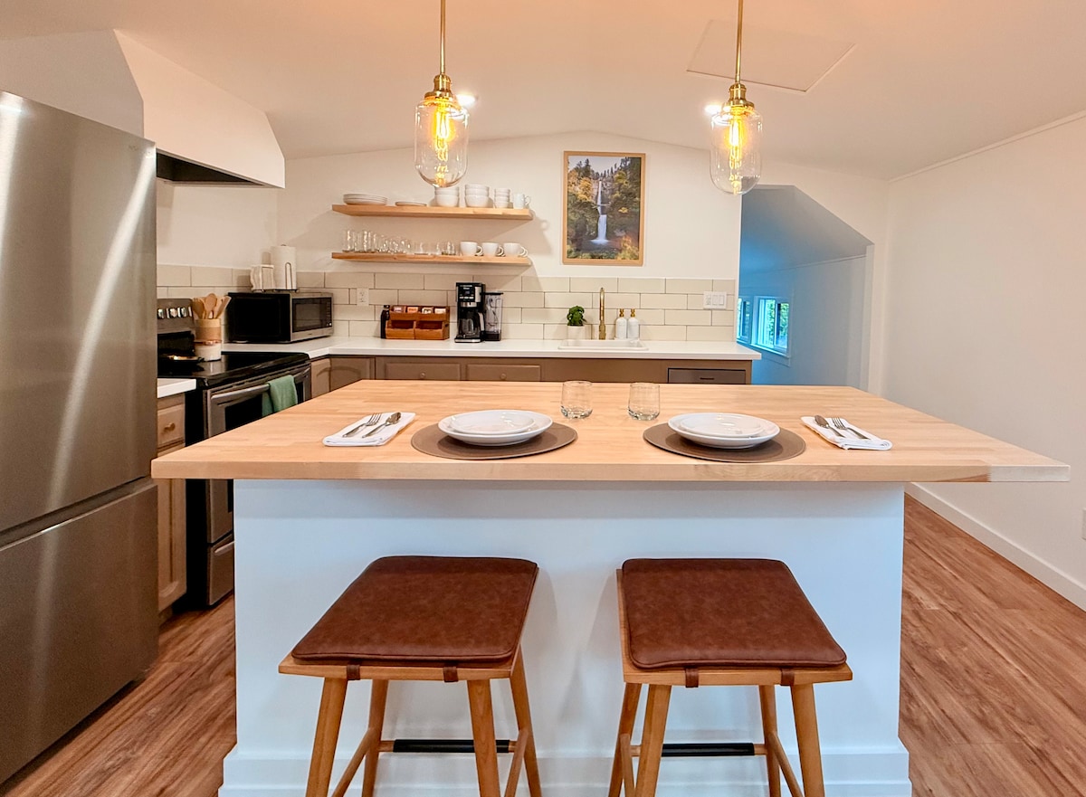 Dette private, renoverte kunststudioet har takvinduer og rolig utsikt over naturen. Som interiørdesigner elsket jeg å skape et sted som er like mye en opplevelse som en natt borte fra hjemmet...og bare 16 km fra sentrum av Portland! Vær oppmerksom på at fra 19. desember 2025 har byggingen begynt på tre hjem bak hytta vår. Arbeidet kan begynne kl. 07.00–19.00 man.–fre., kl. 09.00–17.00 lør.– Søndag. Det kan være støy i løpet av disse timene, det er utenfor vår kontroll.