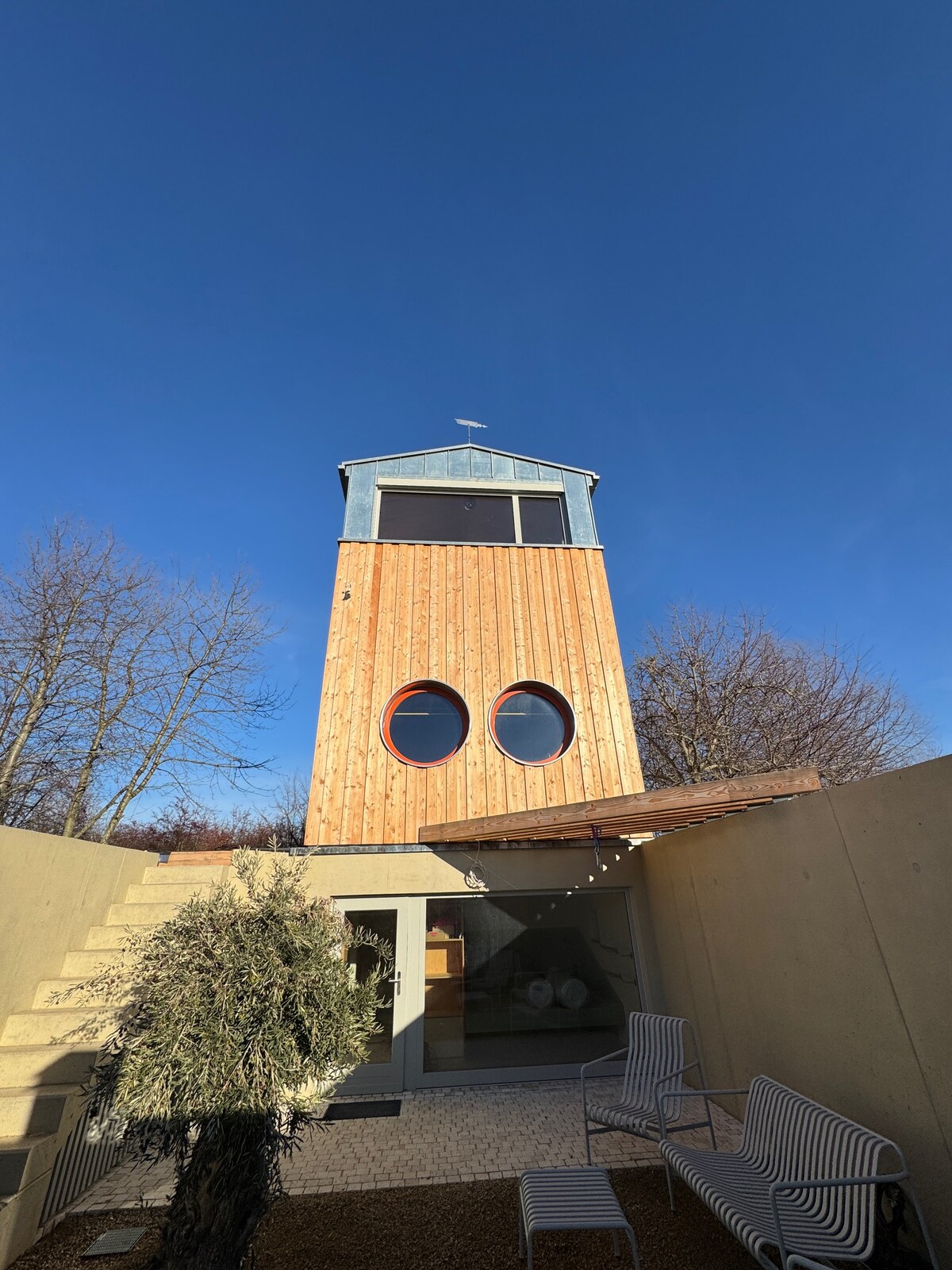 Feriehuset har 160 kvm boareal og 5 soverom for 10 pluss 2 personer. Det ligger midt i Leipzig Neuseenland ved Hainer See 20 km sør for Leipzig. Kjernen i huset er en 70 kvm stor spisestue/stue med store vinduer, langt spisebord og peis. Det er to store terrasser, fra den øverste har du utsikt langt over innsjøen. Huset ble bevisst designet for sosiale dager i større sirkler. For barna er det mange bøker, leker og et lekeunderlag.