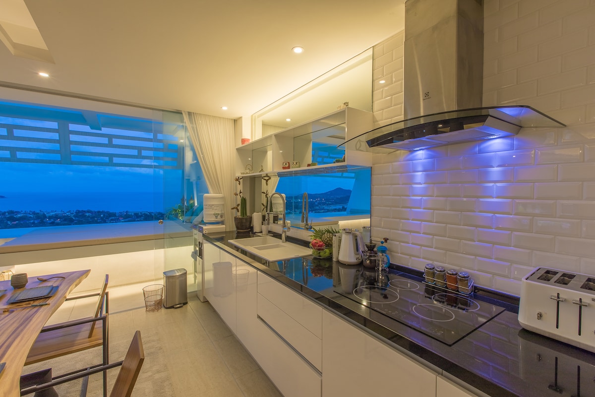 620 kvm privat luksusvilla med 180° havutsikt på bakkene i Chaweng. → Daglig frokost og rengjøring → 25 meter høyt evighetsbasseng. → Treningssenter, billard, dart og bordtennis → Gjestfrihet med personale på stedet døgnet rundt (engelsk, thailandsk) → Eggeskall i betong og badekar i → hvert soverom med privat bad. → Høyhastighets internett og trådløst nettverk → kino smart TV med Netflix → Bose lydanlegg → gratis kaffe og drikkevann → Vann og strøm er inkludert. → Ti minutters kjøretur til strender. → Flere tjenester er tilgjengelige på forespørsel
