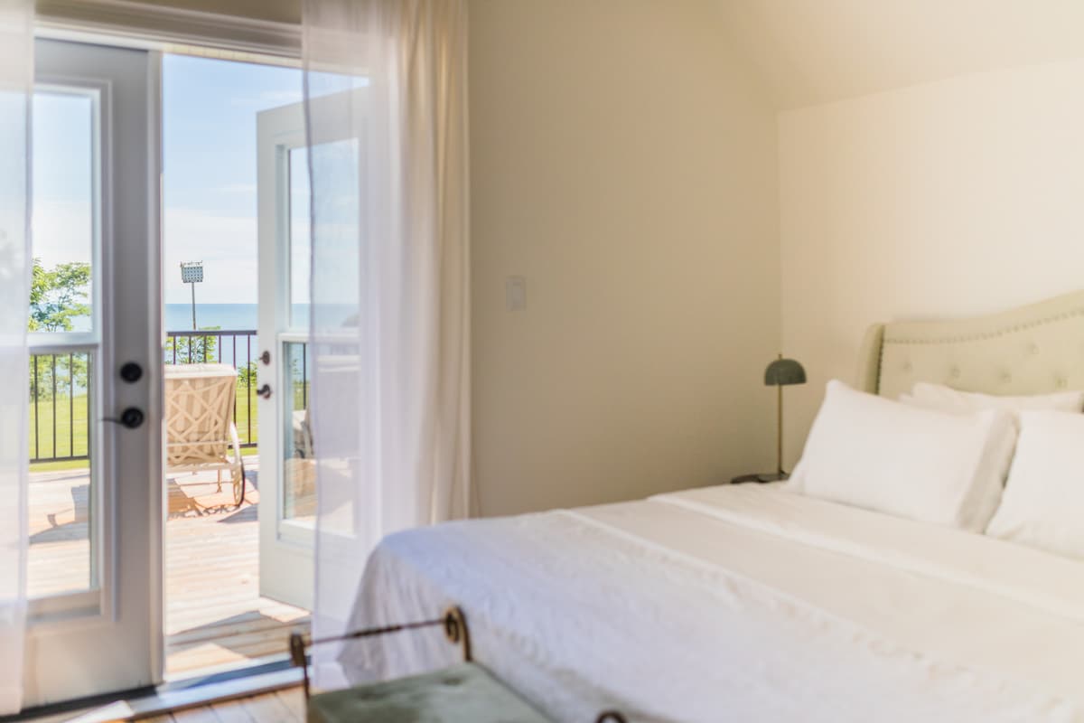 🇨🇦 En rolig suite med to queen-senger, utsikt over innsjøen, tre minutters gange til Erie Rest Beach, tre minutter med bil (20 minutters gange) til landsbyen. Alt strandutstyr inkl. Stoler, strandmatter, håndklær, solskjermingstelt, flytebåter, parasoller! Massevis av innendørs brettspill, alt du trenger for å lage mat eller grille. Slapp av, lek, handle, lytt til levende musikk, spis ute på utmerkede restauranter eller få mat levert! Mange ting å se og gjøre! Nyt naturen (hjort og havørn) på en fredelig privat terrasse. Klimaanlegget er iskaldt, eller kos deg ved gasspeisen!