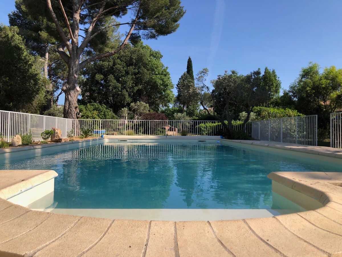 Lite og rolig hus på 45 m2, som ligger ved siden av vertene midt blant oliventrær. Nær tilgang til motorveiene, Aix en Provence (15 min), Marseille (40 min) og 30 minutter fra Côte Bleue. Personlig parkering foran huset - privat terrasse (bord og stoler) Tilgang til svømmebassenget vårt (fra 10:00 til 21:00, ikke oppvarmet) og sommerkjøkken (pizzaovn, grill, kjøleskap, vask, toalett, bestikk...) fra juni måned.