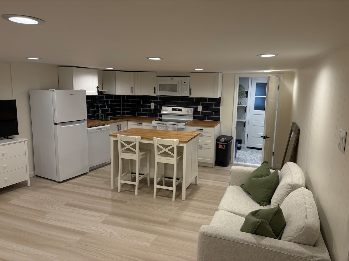 Denne leiligheten med egen privat inngang ligger under vårt mursteinshus i Cape Cod-stil. Enheten er totalrenovert med luksuriøse fasiliteter. Det er en koselig bohemsk hytteatmosfære med et snev av Miyazaki-anime-magi. Åpen planløsning inkluderer et fullt utstyrt kjøkken med oppvaskmaskin (og ny Nespresso!) pluss et separat soverom med en komfortabel kingsize-seng og et privat bad med en stor dusj. Parkering utenfor gaten, raskt trådløst nettverk og sovesofa for ekstra gjester. Ingen røyking inne, takk.
