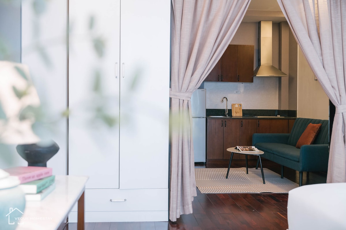 Oppdag en skatt i en større gate i Hoan Kiem-distriktet. Rommet ligger i nærheten av gamlebyen, badet i naturlig lys fra et stort vindu, noe som skaper en koselig atmosfære. Lyden av leverandører og dufter fra de travle gatene bidrar til den livlige sjarmen. - 7 m gange til gamlebyen, – 10 m til Hanoi jernbanestasjon – 20 minutter til kveldsmarkedet. - elevator - gratis vaskemaskin og tørketrommel - berømte restauranter og kafeer i nærheten - Fullt utstyrt kjøkken - Netflix - SIM-kort til salgs