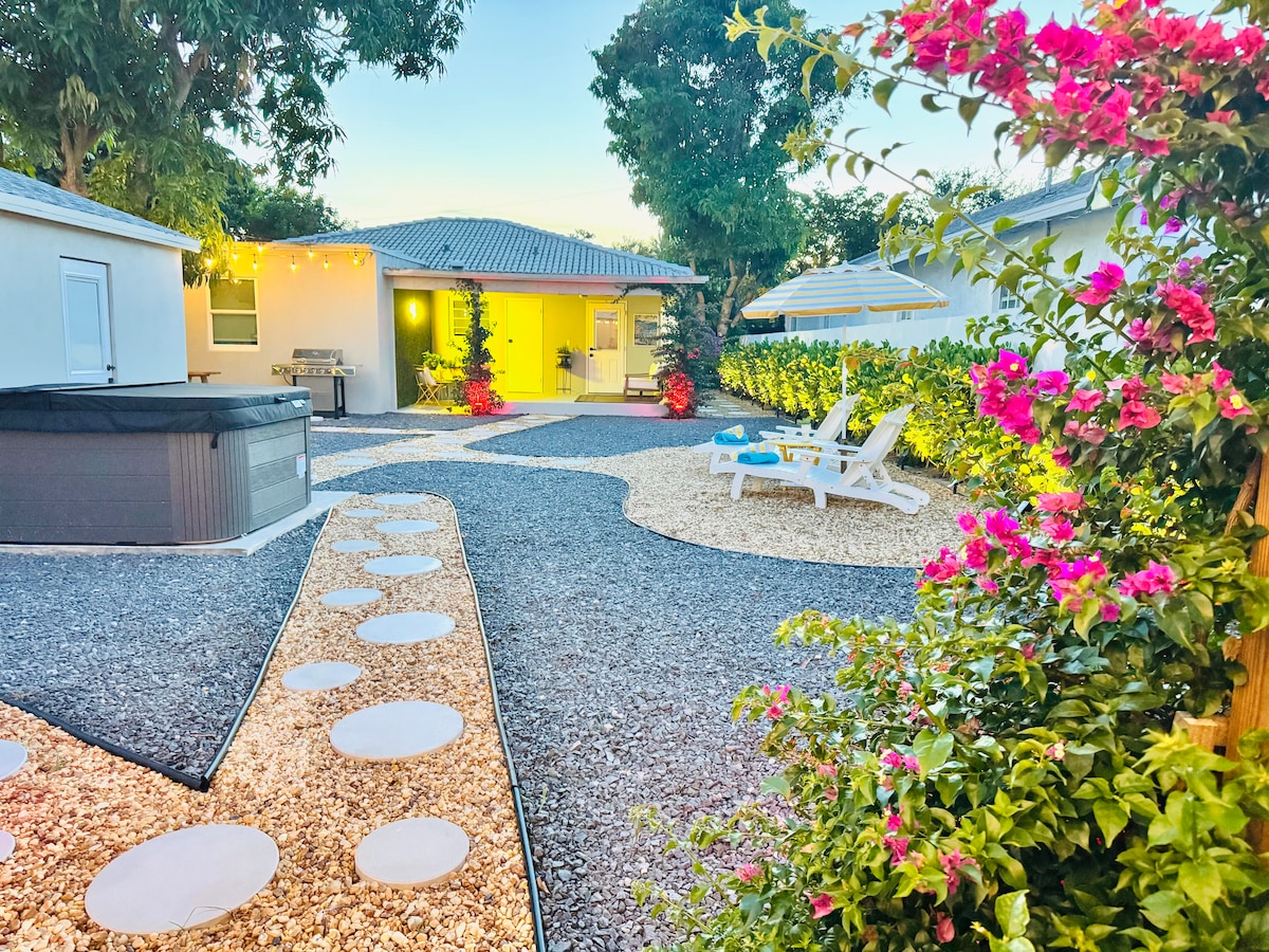 Velkommen til «Royal Poinciana» i Lake Worth Beachs historiske distrikt! Vår vakre, fullt oppussede 1920-talls hytte ligger 100 meter fra Intracoastal Waterway, en mile fra Lake Worth Beach, og bare noen kvartaler til sentrum. Du har et fullt utstyrt kjøkken med førsteklasses apparater, en stor privat hage med utedusj og bålplass, vaskerktøy, trådløst nettverk og Roku-TV. Inkluderer to strandcruisersykler, strandstoler, håndklær og parasoll. Bli forelsket i den fantastiske oasen vår!