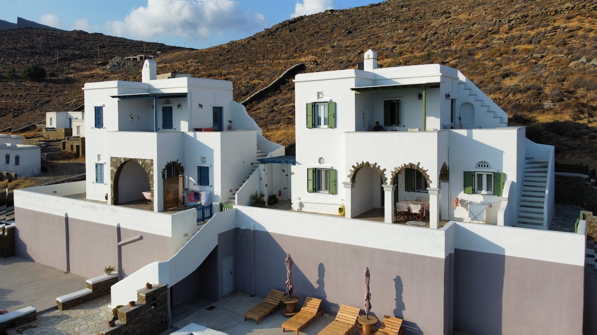 Huset ble bygget i 1887 i Arnados, en landsby bygget som et amfiteater med utsikt over øyene Mykonos, Syros, Paros og Naxos. Huset er på 90 kvm for fire gjester og ble pusset opp i 2006–2008 med hensyn til alle arkitektoniske elementer. Består av to soverom (med tradisjonelle dobbeltsenger), bad med dusj, stue med tradisjonell hjørnesofa, peis, kjøkken og stor veranda på 70 kvm med panoramautsikt over Kykladene.