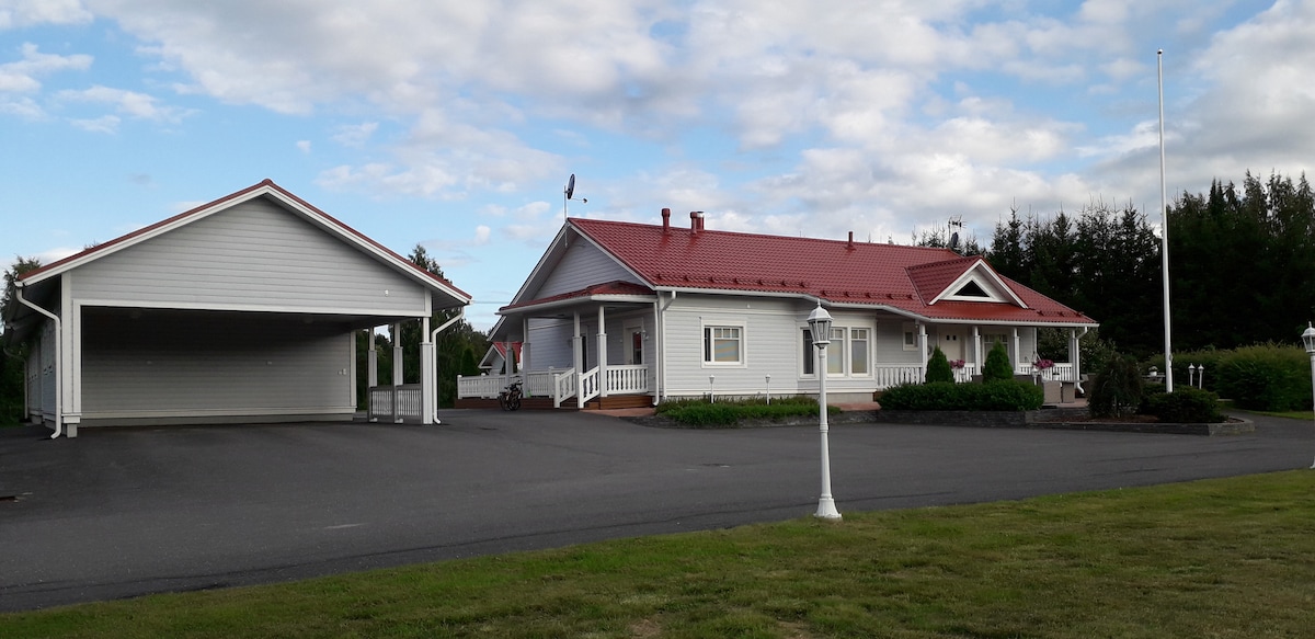Fullt utstyrt feriehus ferdigstilt i 2007, 140 m2 - 4 MH, plass til 8-10 *, badstue, 2 toaletter, boblebad, peis, veldig store terrasseområder. Fantastisk beliggenhet ved elven Lapuan, rett overfor fornøyelsesparken Power Park. Rolig sted i enden av gaten, ingen gjennomfart. Stor tomt og hage på 3000 m2, stor asfaltert gårdsplass på 600 m2 - passer for større kjøretøy. Butikker ca. 700 m, fornøyelsespark maks 1,3 km å gå. Røykfritt inne, INGEN kjæledyr * SENGER: 1 x180cm, 1 x160cm (2x80cm), 3 x120cm, 1x90cm. Egnet for familier