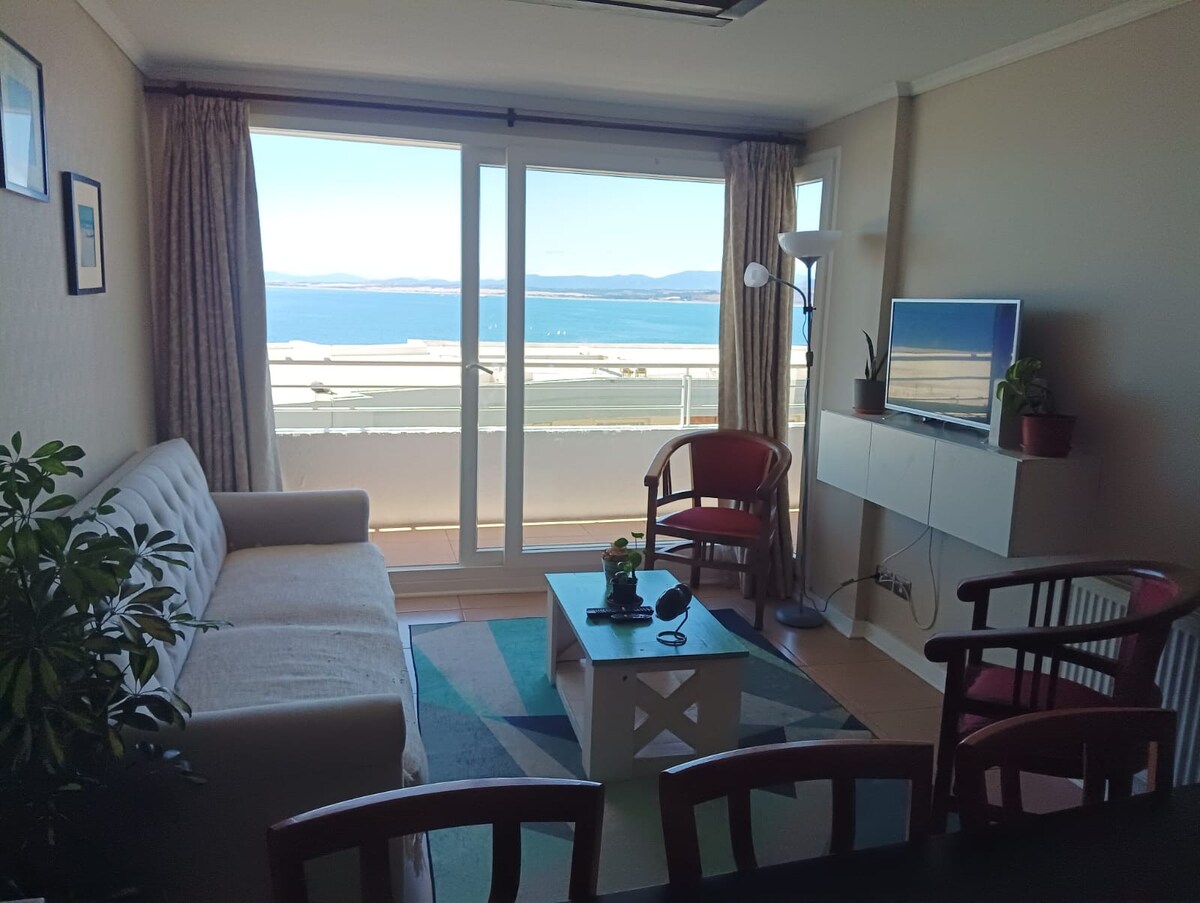 [Rabattert pris for lunsj! Klar til å nyte] Utrolig leilighet for fire personer med en fantastisk utsikt over havet. To soverom og ett bad. Hovedsuite med dobbeltseng, en annen med køyeseng og en sovesofa for én ekstra person. Sengetøy tilgjengelig. TV (med Netflix) og skrivebord for hjemmekontor på et fantastisk sted og trådløst nettverk med høy hastighet. Ligger i nærheten av kjøpesenteret Marina Arauco, supermarkedet Lider/Wallmart og minutter unna Las Salinas-stranden. Inkluderer én parkeringsplass. Kjæledyr er kun tillatt mot en ekstra kostnad.
