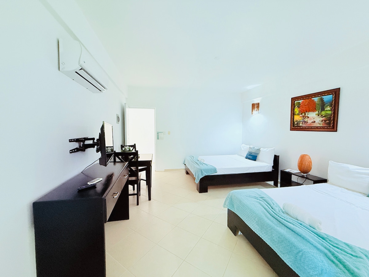 Standard dobbeltrom Lyst, romslig og innbydende – vårt standard dobbeltrom er perfekt for familier, par eller venner som søker komfort og letthet bare noen skritt fra stranden. 🛏️ Funksjoner: • To queen size-senger • Aircondition for din komfort • smart-TV med flatskjerm. • Eget bad med varmt vann og dusjsåpe. • Moderne karibisk innredning med varm belysning og levende kunstverk • gratis trådløst nettverk