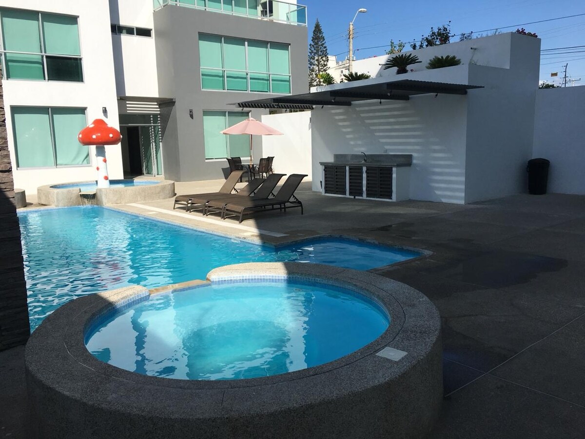 Dupleksleilighet som har alle fasiliteter for å gjøre oppholdet ditt veldig behagelig, ligger 200 meter fra Chipipe-stranden, den beste stranden i Salinas!!!