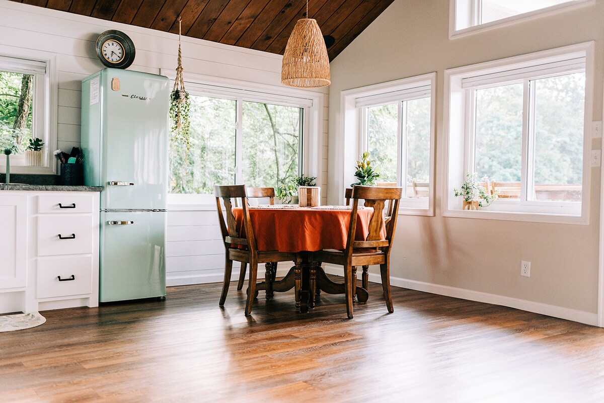Nestled in the heart of Frenchtown NJ, you'll find enchantment hidden in the lush gardens of River Witch Cottage. • Restore yourself in a luxe queen bed • Prep a simple meal in the fully equipped kitchen • Nourish yourself in the charm of an intimate dining area • Recline in cozy comfort beside a beautiful gas fireplace • Rejuvenate in the jets of the jacuzzi tub, soaking under the natural glow of skylights • Morning coffee or evening wine in the tranquil setting of the private outdoor patio