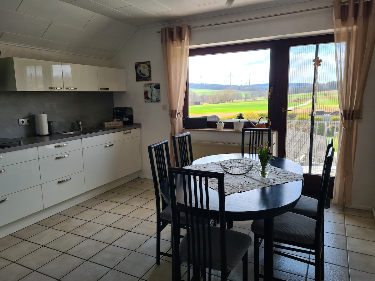 This comfortable 108m² ground-floor apartment (barrier-free) boasts a charming village-like location on the outskirts of town,with easy access to the baroque city of Fulda and the nearby Rhön region. In addition to two bedrooms and a children's room,the apartment features two bathrooms.The spacious living room,equipped with a 55-inch smart TV,open-plan dining area and fully equipped kitchen,is sure to impress.The cozy ambiance of a wood-burning stove and a bathtub invite you to relax and unwind.