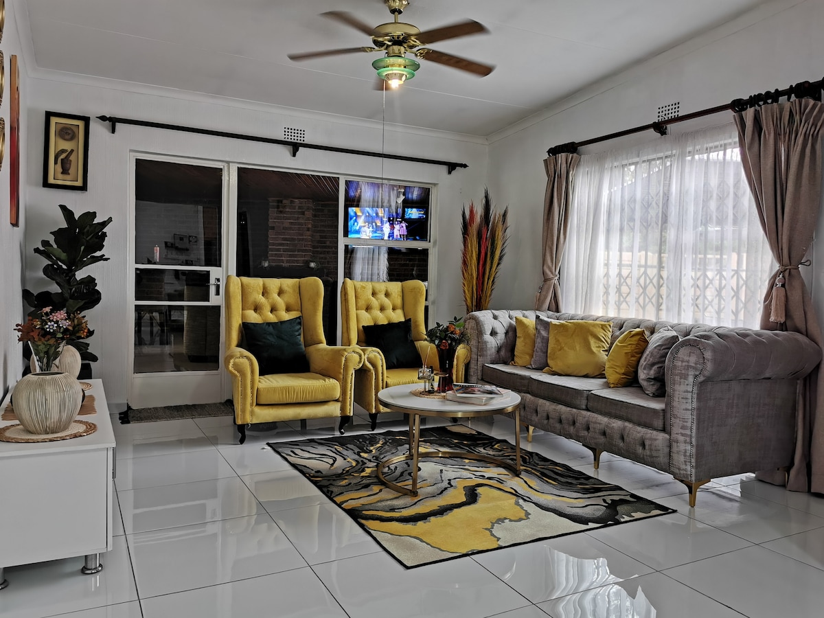 Plassert i en rolig blindvei og trygg. Spiseplass og fullt utstyrt kjøkken med gassovn. Koselig stue med smart-TV, Showmax/Netflix/YT. Gratis, raskt trådløst nettverk uten begrensninger. Tre soverom i andre etasje, hvert med et skrivebord som åpner seg mot en pyjamasstue. Hovedsoverom med kingsize-seng, eget bad, jetbad og balkong. Privat hage med vegger, stor mursteinsgrill/braai og møblert Lapa. Porttilgang til parken. Vaskemaskin, roterende klessnor. Enkeltgarasje. Passer for grupper, familier, lange og korte opphold!